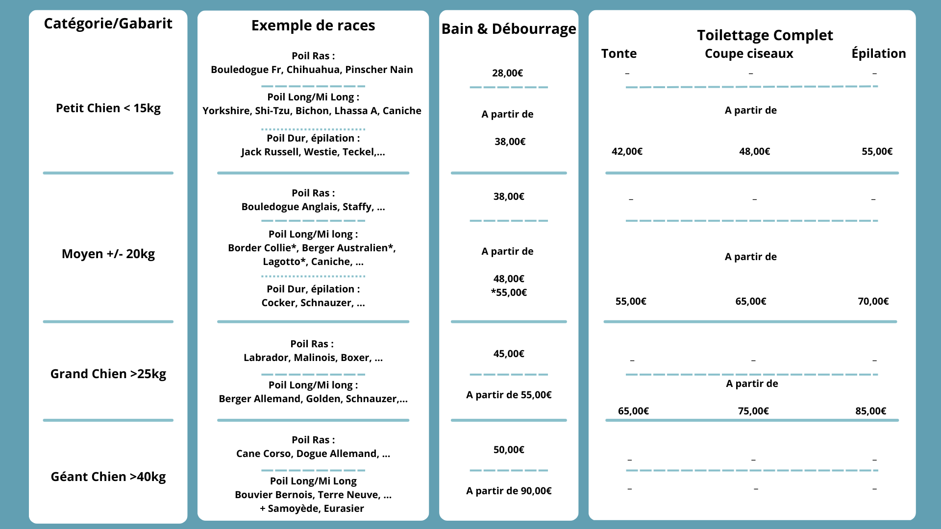* Prix à partir de, cela sera en fonction de l’état général de votre animal et du temps passé